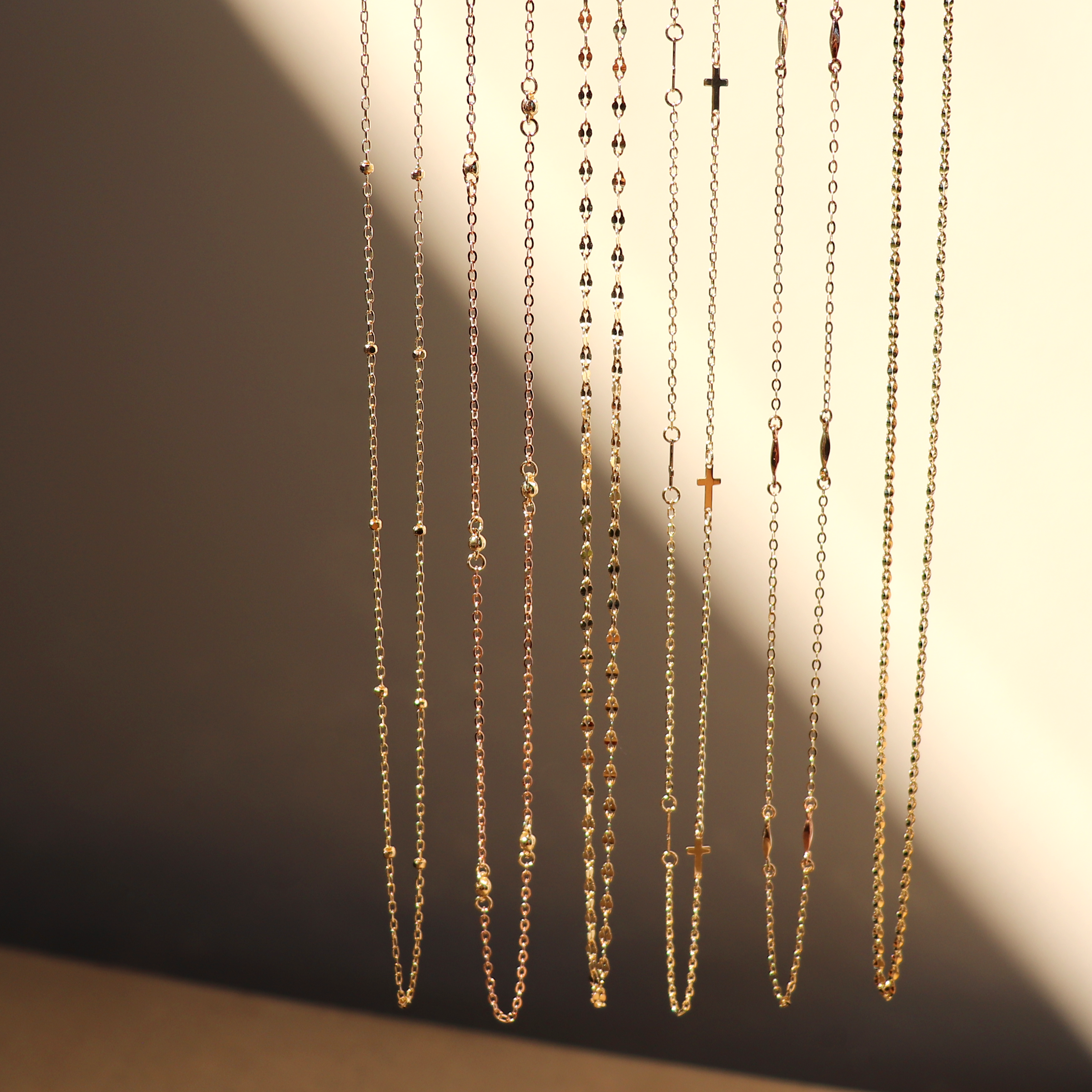 带有切割细节的微型立方体球沿着一条精细的金色层友好链间隔开。